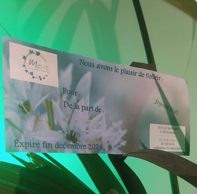 - Option 2 : Nous fixons un rendez-vous en personne. Vous pourrez régler par chèque ou espèces, et je vous remettrai le bon cadeau en version papier.